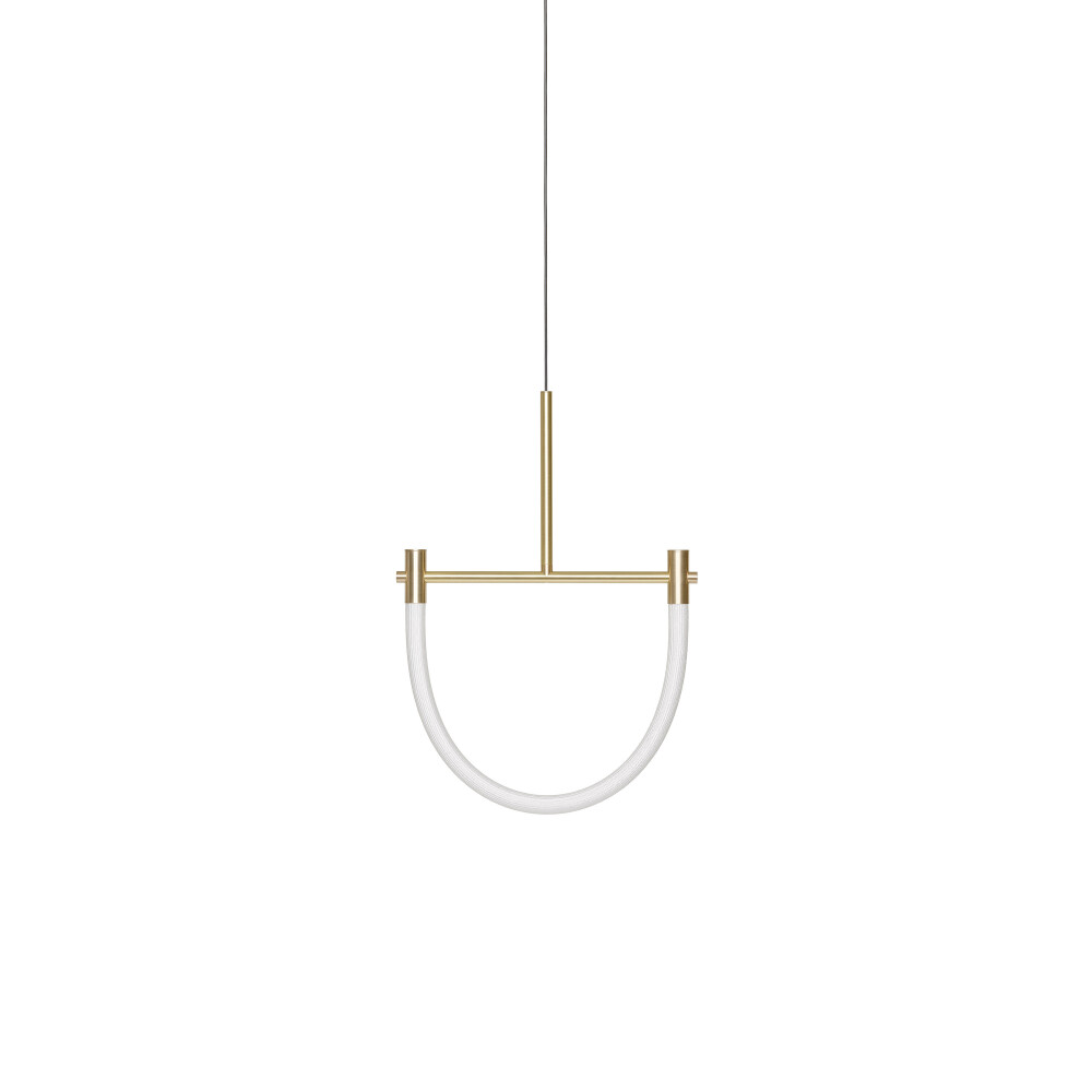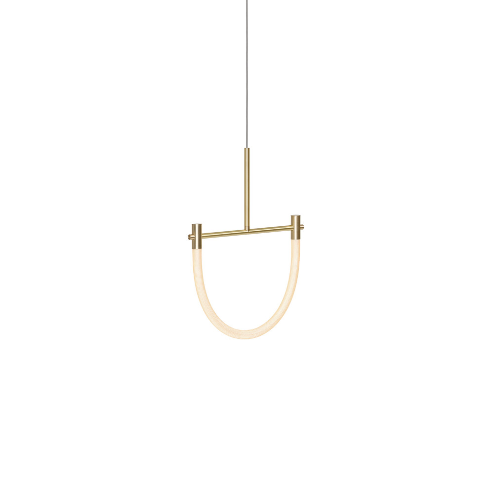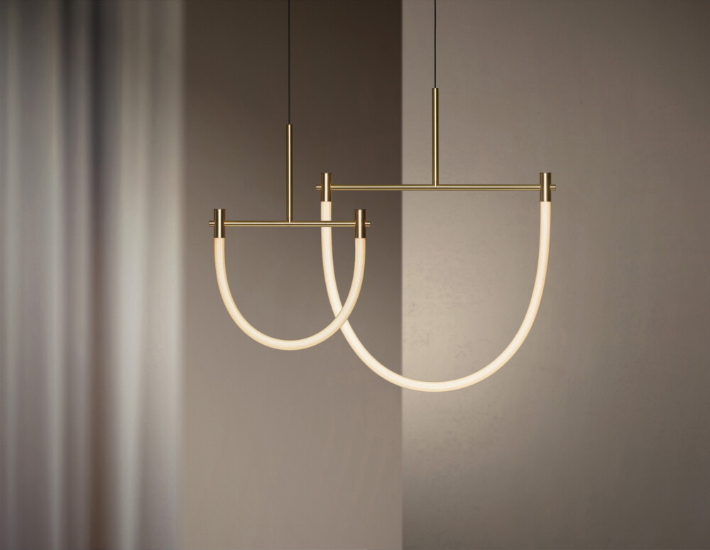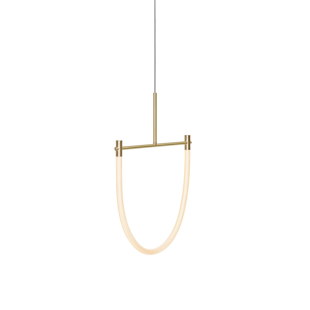 Levity is a series of minimal and poetic flexible lights, combining a rigid metal frame with a draped textile shade. Feelings of both lightness and gravity are prompted by the Levity loop’s elegant, gentle forms. A variation on the Levity Halo pendant, the Levity Linear styles are a commitment to effortlessness; the powder coated metal frame holds up the soft, draped light in a simple, elegant statement. A LED source is enclosed within a flexible silicone tube and wrapped in a nylon textile sleeve, providing even diffusion that conceals the integrated LED light source. Offered in two lengths – the fixtures can be layered together or used as a singular lighting statement.