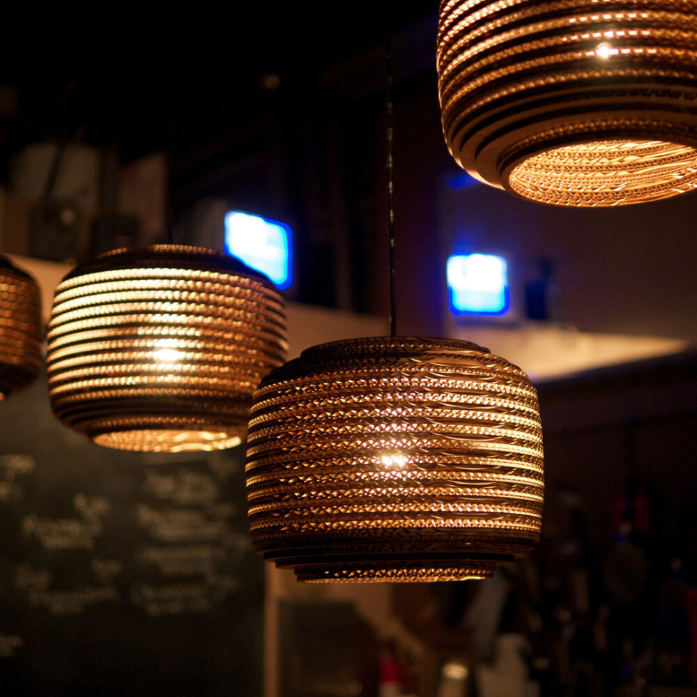 Scraplights are constructed from natural recycled cardboard precision cut by a laser. This gives the edges their classic dark appearance and enhances the warm light projected through the corrugation. Ausi is available in three colors and 3 sizes.