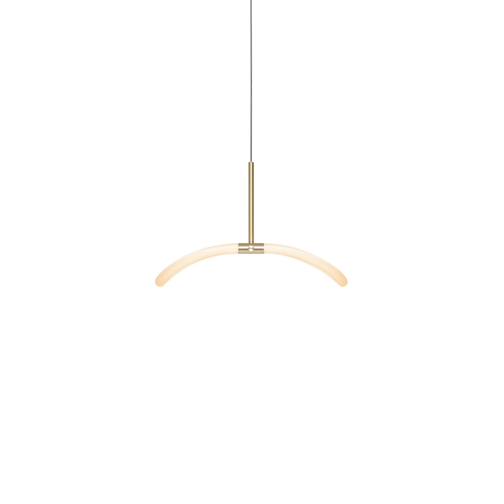 Levity is a series of minimal and poetic flexible lights, combining a rigid metal frame with a draped textile shade. Feelings of both lightness and gravity are prompted by the Levity loop’s elegant, gentle forms. A variation on the Levity Halo pendant, the Levity Linear styles are a commitment to effortlessness; the powder coated metal frame holds up the soft, draped light in a simple, elegant statement. A LED source is enclosed within a flexible silicone tube and wrapped in a nylon textile sleeve, providing even diffusion that conceals the integrated LED light source. Offered in two lengths – the fixtures can be layered together or used as a singular lighting statement.