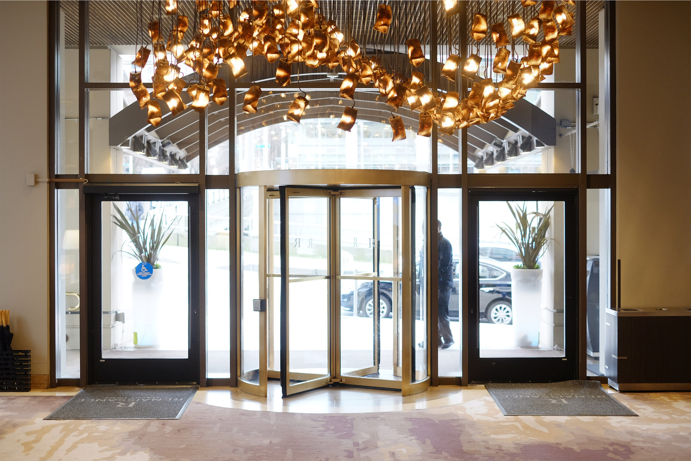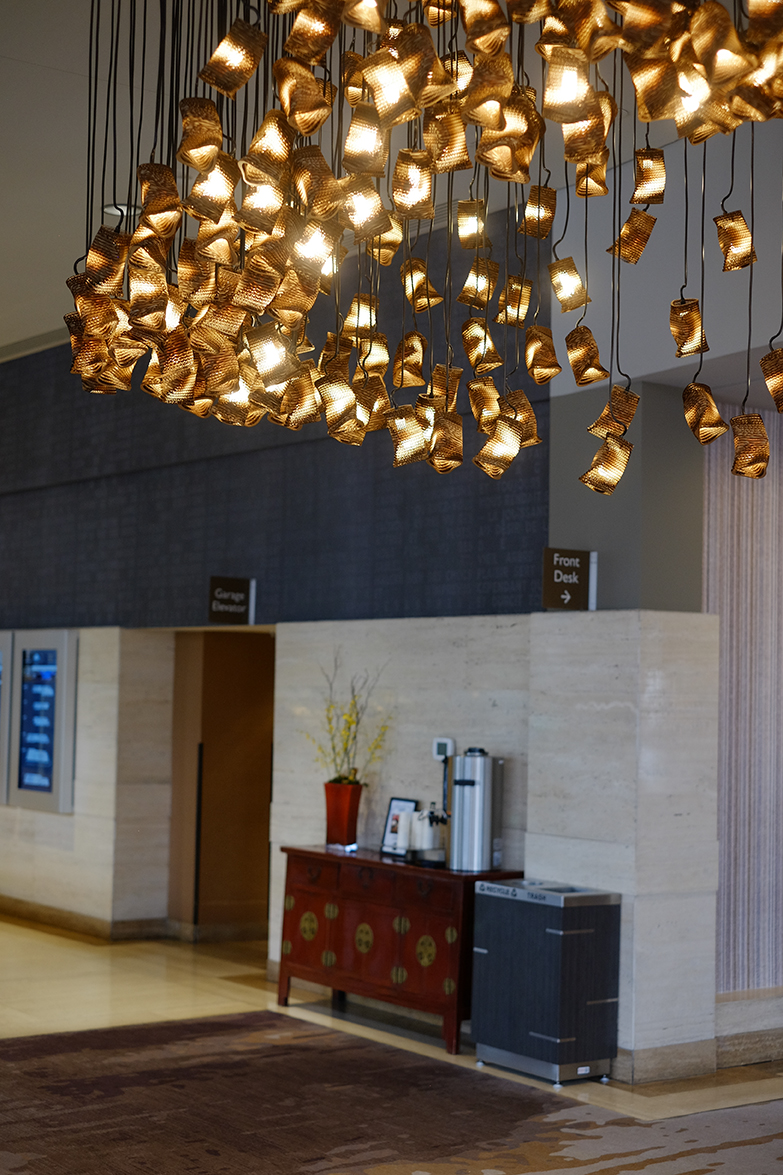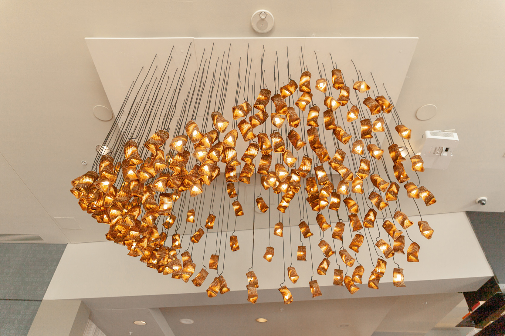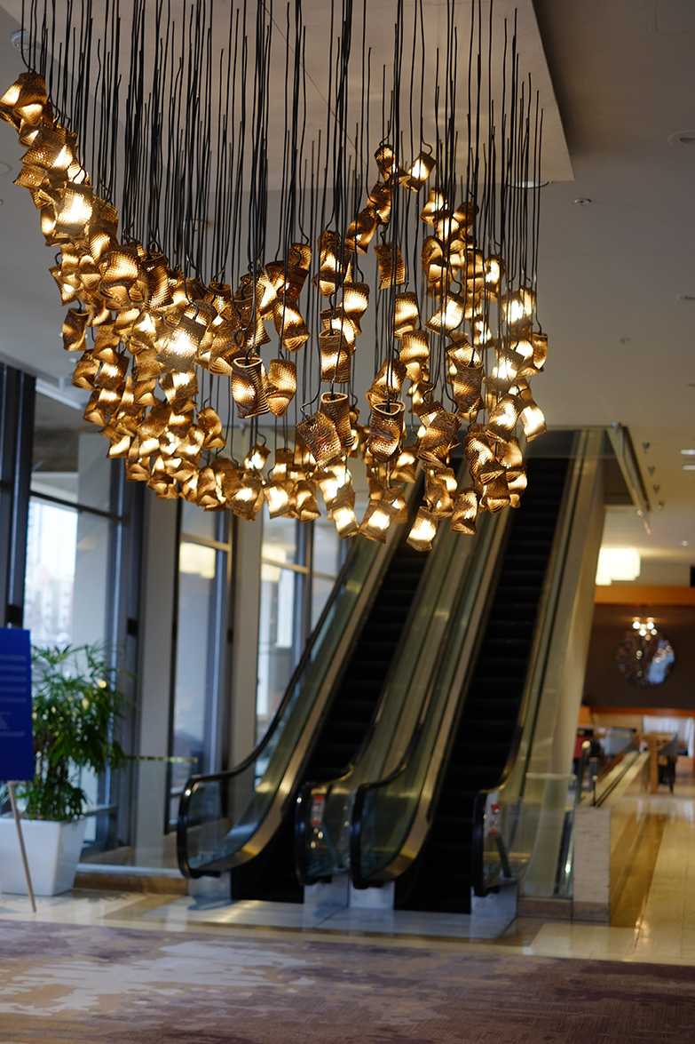 A custom Murmuration in the lobby of Renaissance Hotel, this downtown Seattle located installation anchors the hub of activity for the hotel and enhances presence from the street.